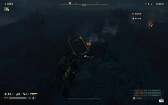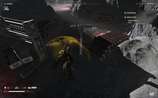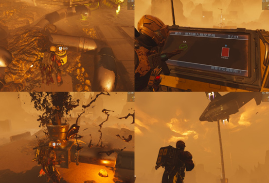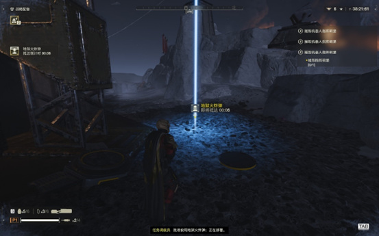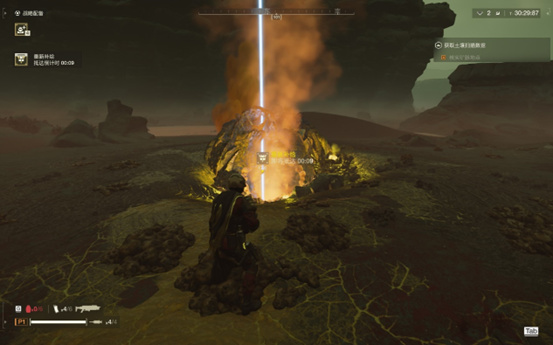 第三阶段是自主着陆阶段。此时,您可以使用箭头键来调整空降舱的具体着陆点,但根据游戏逻辑,太空舱会故意避免落入某些区域(同样可以应用于“复活”的太空舱的着陆点选择)。一般来说,空降舱会避免落在一些需要摧毁的任务目标上,一些无法降落的地方,以及崎岖的地形上(尽管有时您可以降落在山上)。它可以摧毁几乎所有的敌方单位。当你在对抗一些大型敌人时不幸阵亡,并且你对自己的登陆技巧深感自信(或者你的队友直接把你扔出去)时,你可以让你的队友把增援信标扔得离大型敌人更近一些,你可以在下来时直接杀死他们(并让他们尝尝民主和自由空降仓库的滋味)。