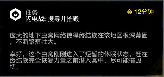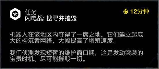 特点:闪电战,时限很短(12分钟)。你可以通过清除一部分来完成主要目标,但清除后可以获得额外的奖励。目标单一,作战强度高。